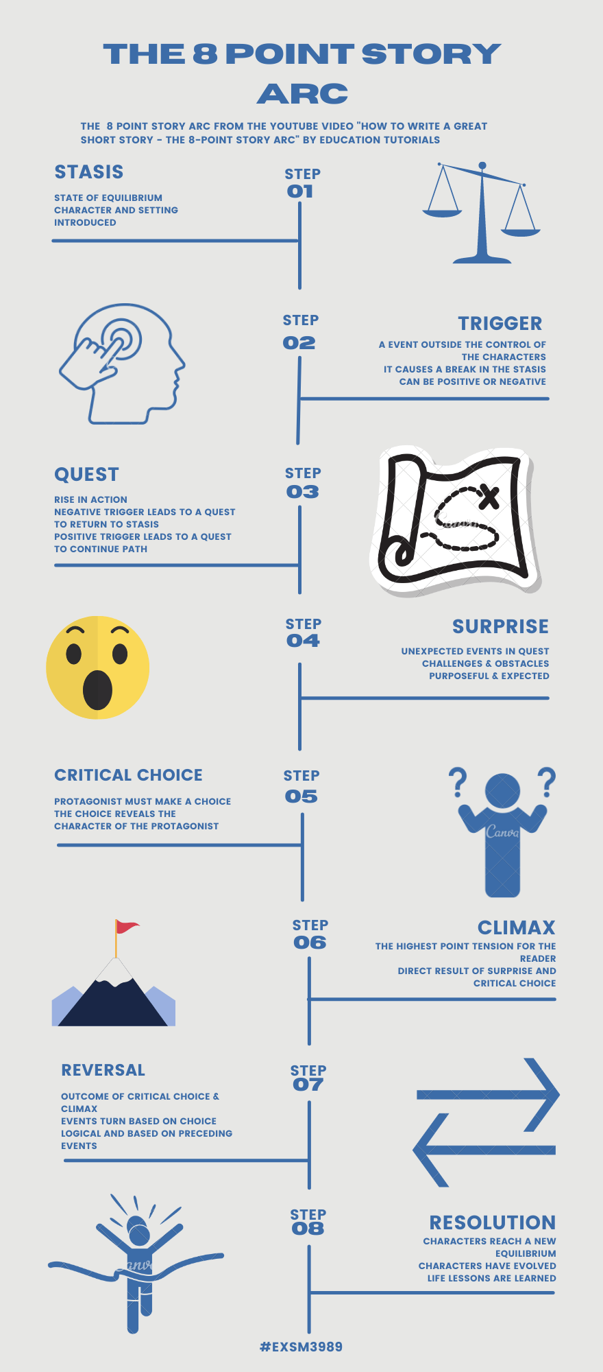 Educational Tutorials’ YouTube video “How to Write a Great Short Story – The 8-Point Story Arc” shows us how we can map out a story.