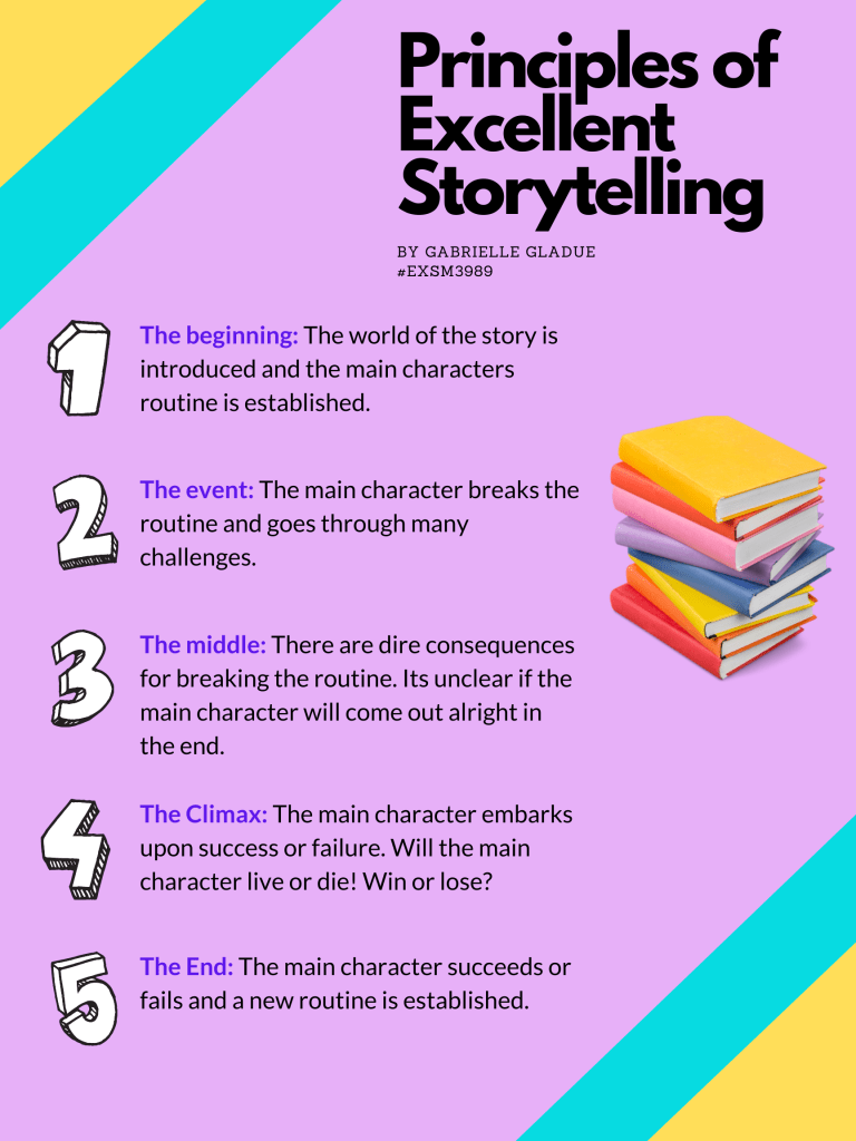 Categories Uncategorized Principals of Excellent Storytelling Post author By ggladue Post date August 1, 2021 No Comments on Principals of Excellent Storytelling My infographic has 5 main principals to follow in order to create an excellent story. Share this: Click to share on X (Opens in new window) X Click to share on Facebook (Opens in new window) Facebook Like Loading... Related ← Telling Stories in the Digital Age → Storytelling with the Eight-Point Story Arc Leave a comment Cancel reply Δ