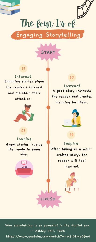 In Ashley Fell’s TED talk, called “Why storytelling is so powerful in the digital era,” she mentions the Four I’s of Engaging Storytelling. Essentially, these are four elements any story must have to engage the reader.