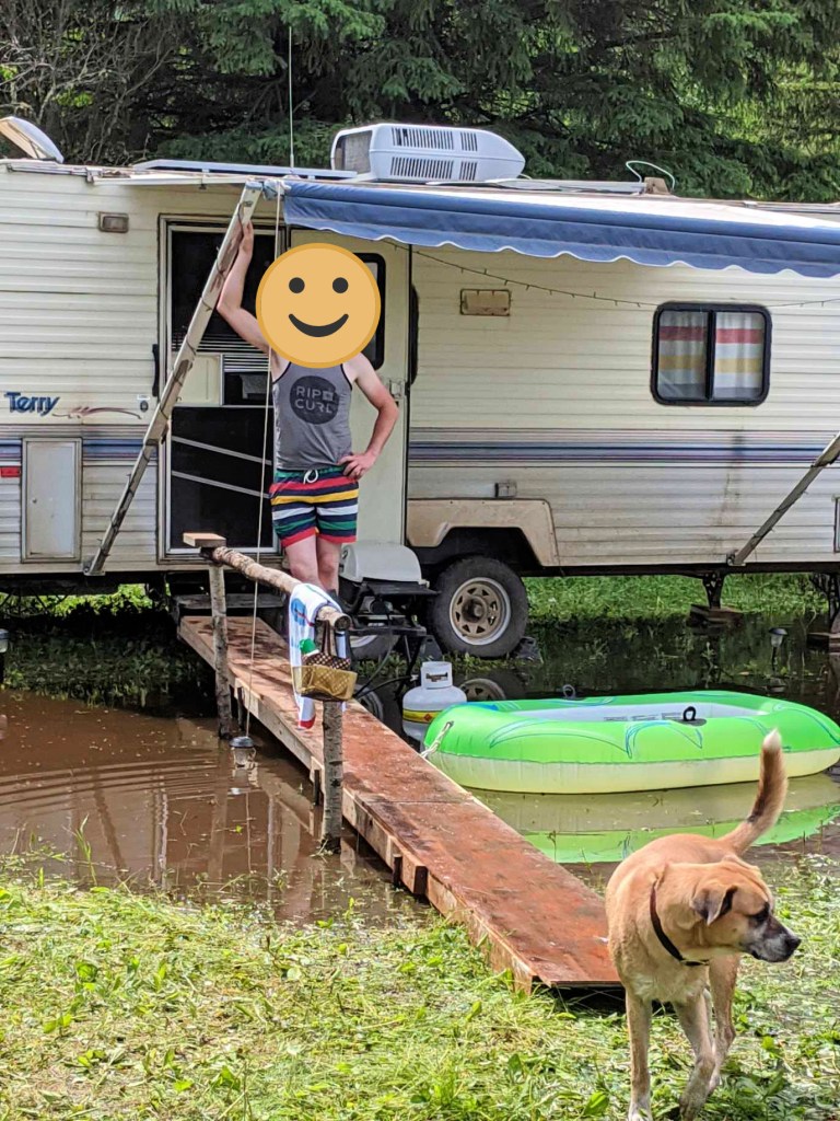 Sploosh!! That was the sound that woke us up the next morning, as we heard my cousin drive in through a few feet of water to get to a spot where he wanted to camp. We all welcomed him to our island and showed him all of the stakes we had placed to watch the water. The rain was letting up again and we had a full day of mostly dry weather, but really, we knew that didn’t matter. What mattered was the weather that was happening upstream in the mountains. This is where the overflow was coming from. We also knew at this point; we were stuck until the creek crested and receded. My cousin set up his trailer, and within hours, he was in water. Being a carpenter with a few pieces of wood in his truck, he built himself a pier to get to his trailer.