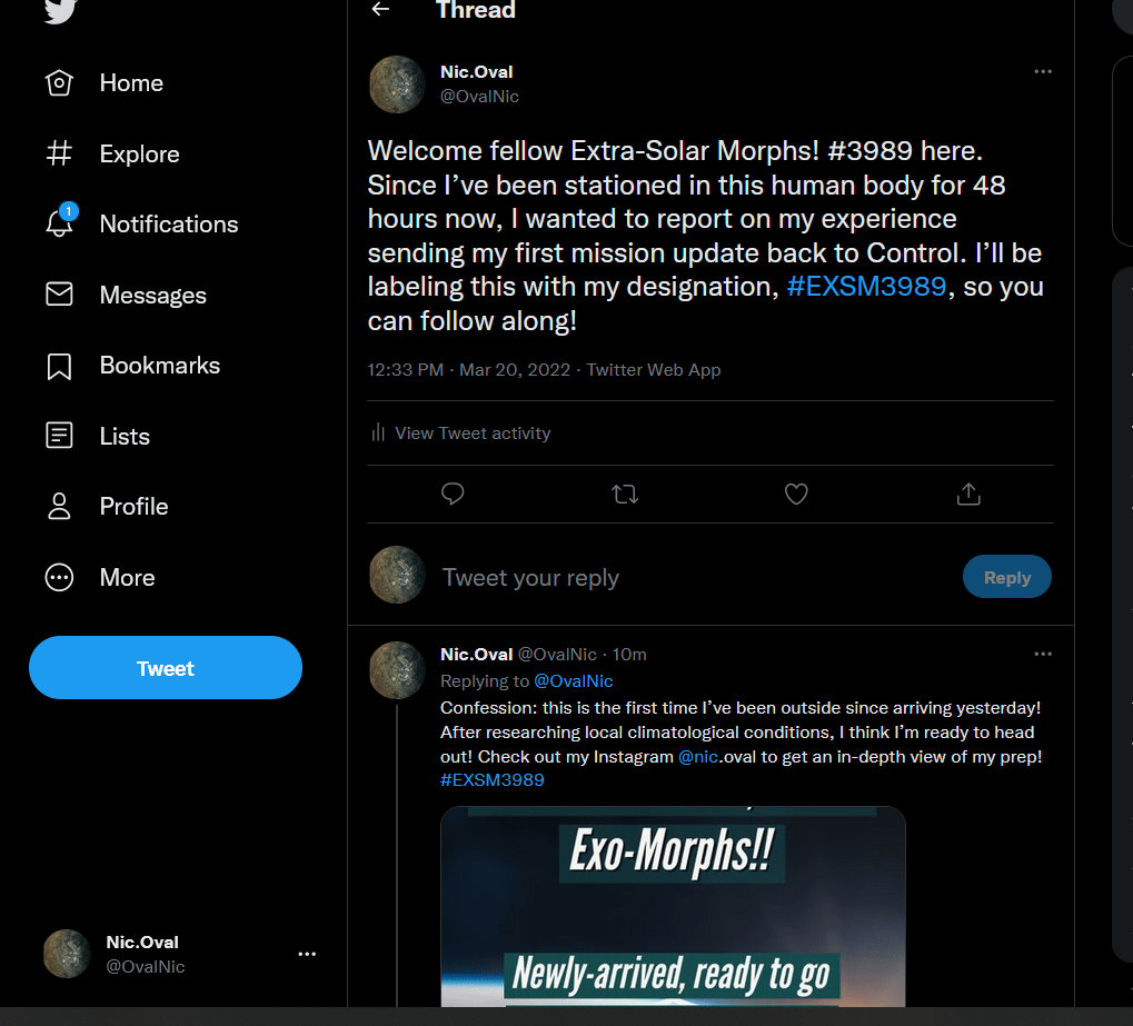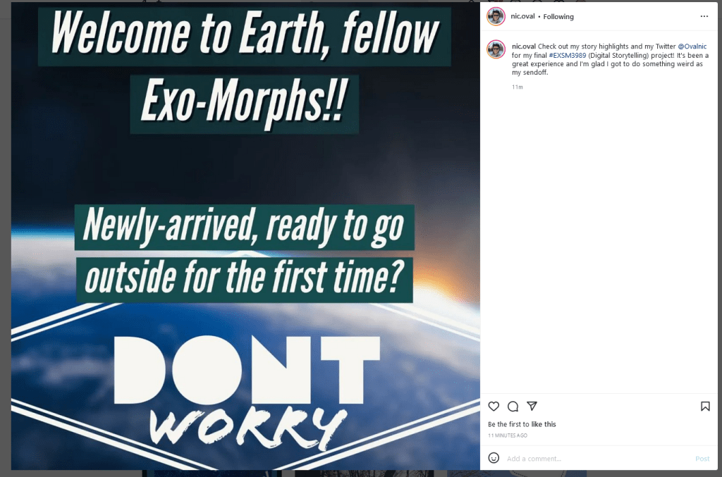 For the final assignment of EXSM 3989, we were asked to use our knowledge of storytelling principles and create a multi-platform story. I wanted to lean into my silly, sci-fi side and write a piece of fiction on my Instagram and Twitter.