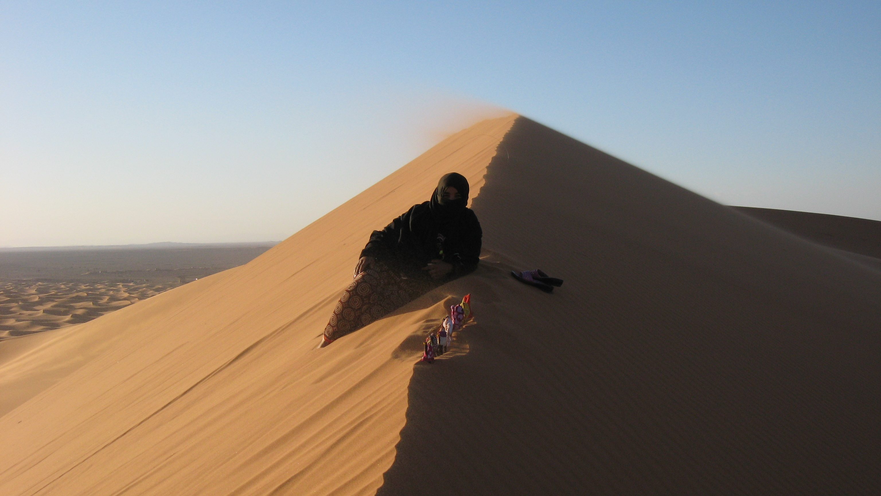 Now out here in the desert, atop a sand dune, I find myself face to face with a mysterious woman I name “The Girl.” Part of her face is veiled, as is mine to keep out the blowing particles of sand. Despite the many boundaries that divide us, I look into her eyes and see kindness and warmth, a stark contrast to the desolation and chilly temperature that envelop us.