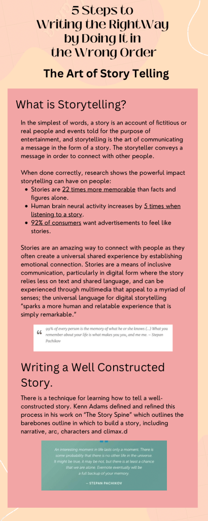 Categories Uncategorized EXSM3989 Storytelling Infographic Post author By Post date December 10, 2022 No Comments on EXSM3989 Storytelling Infographic Share this: Click to share on X (Opens in new window) X Click to share on Facebook (Opens in new window) Facebook Like Loading... Related ← Tips for Telling Stories → Digital Storytelling Leave a comment Cancel reply Δ