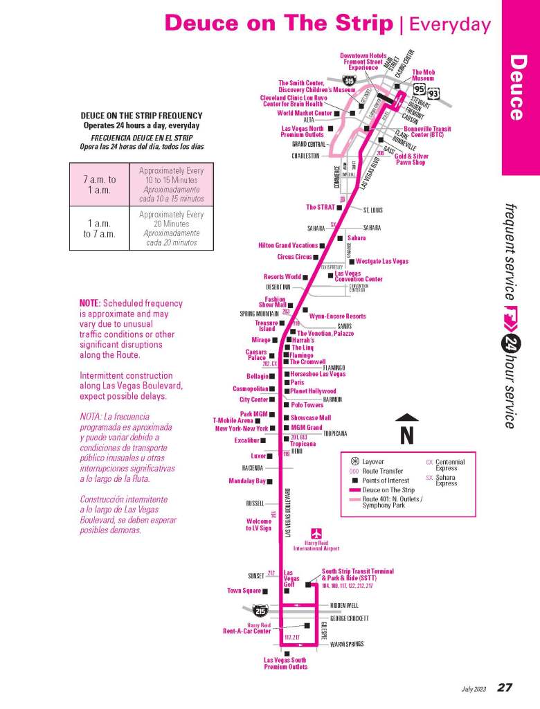 - The Deuce is a double-decker bus that services the Strip to Freemont Street and back. You can purchase a 3-day pass for roughly $20 USD. I did find this to be a valuable investment for those nights when your feet are done, and instead of paying for a cab all the time, it is a cost-effective alternative.