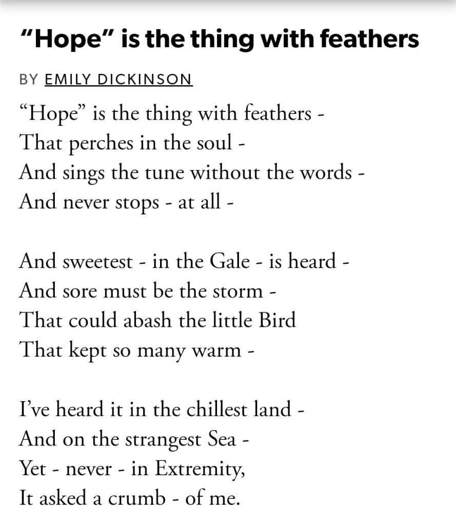 References: Emily Dickinson, https://www.poetryfoundation.org/poems/42889/hope-is-the-thing-with-feathers-314