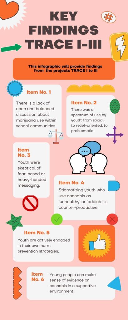 In 2006, the research project TRACE (Teens Report on Adolescent Cannabis Experiences) was launched. Researchers at the Nursing faculty at the University of British Columbia strived to understand the context in which youth cannabis use took place. The ‘data’ of the research consisted of interviews with teenagers. The research team interviewed 77 teenagers who shared their thoughts and experiences with cannabis.
