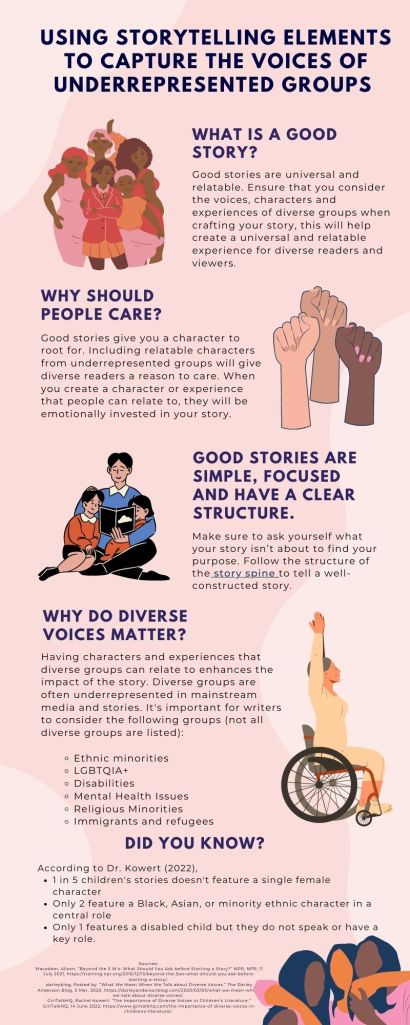 Some diversity elements to consider when writing include ethnic groups, levels of physical capabilities, levels of mental health, religious groups and sexual orientation. This is not a comprehensive list but a starting point when considering the voices of underrepresented groups in digital storytelling.