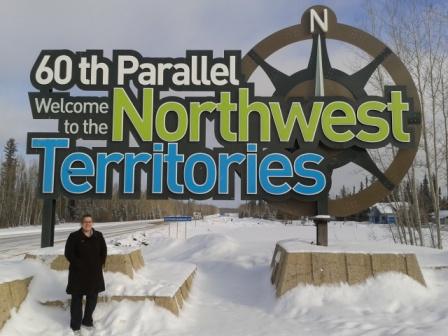 It was now the 5th day of our trip and we finally saw snow! For the entire trip thus far, the weather was unseasonably warm which we were grateful for. The snow meant we were closer to our destination. We drove a lot this day as the final road from Alberta to the Northwest Territories is a long and quiet straight away. The highlights of this drive were stopping at the North of 60 sign and driving on the frozen Mighty Mackenzie! (Our GPS was confused and if it could scream, it would have).