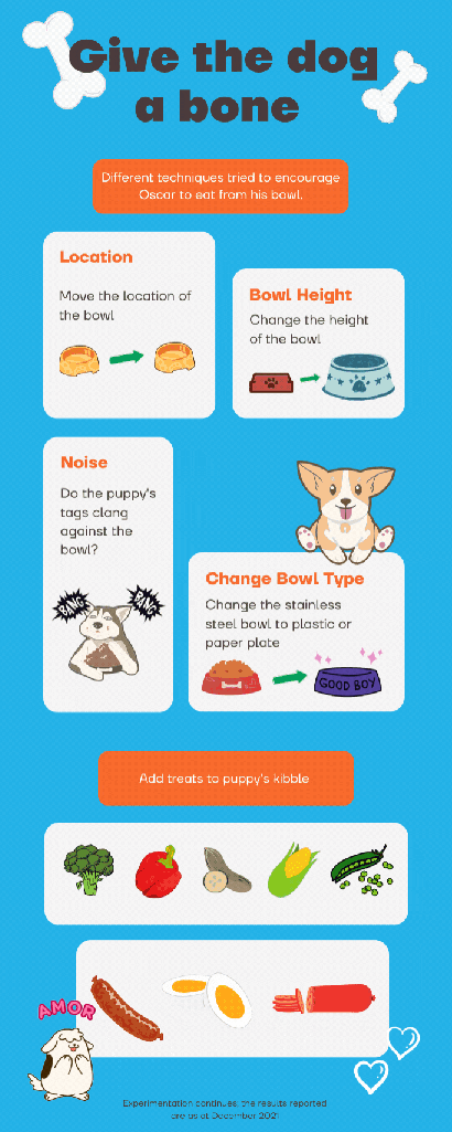 Even adding treats to the bowl couldn’t entice Oscar to eat. He would take pieces out and eat off the floor instead!