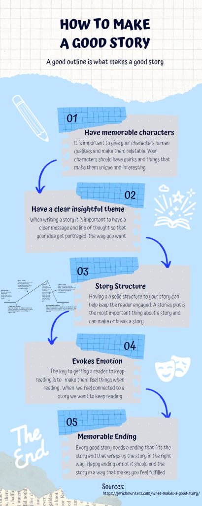 Stories have been being told since the beginning of time in many different ways, from campfire stories to a novel to drawings on a cave wall, they are all stories that have been told to people to provide knowledge, entertainment, or life skills. Stories are the original way to pass knowledge around and if we didn’t have stories we wouldn’t have the knowledge about the past that we do today. The structure is the biggest part of making a good story, if you don’t have memorable characters, a clear theme, story structure, a memorable ending and something that evokes emotions. This formula for a story can put you on the track to writing a good memorable story that people will enjoy and recommend to their friends.