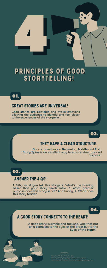 Good stories connect to the eyes of the brain but, more crucially, connect to the eyes of the heart! Principles of good storytelling, especially in the digital age, serve as a vital reminder. With more innovative platforms and mediums and their ever-growing tools, which certainly play a role in enhancing the audience’s experience, a good story, in the end, remains simple and one that speaks to the heart of its audience.