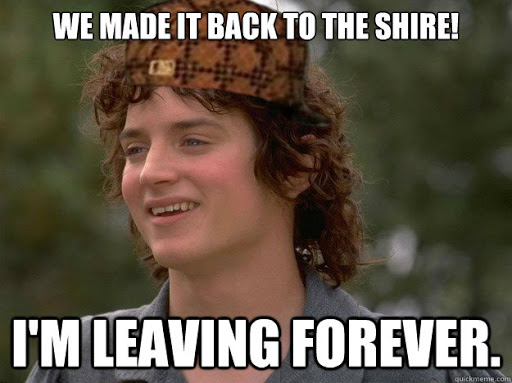 Frodo destroys the Ring, saves Middle Earth, and returns to the Shire with the other hobbits, until he decides to depart Middle Earth.