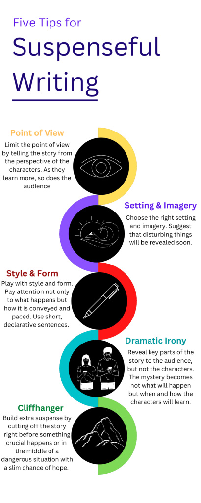 While the included tips help suspenseful storytelling, it is also important to include relatability, build up of tension and suspense, emotion, authenticity and urgency.
